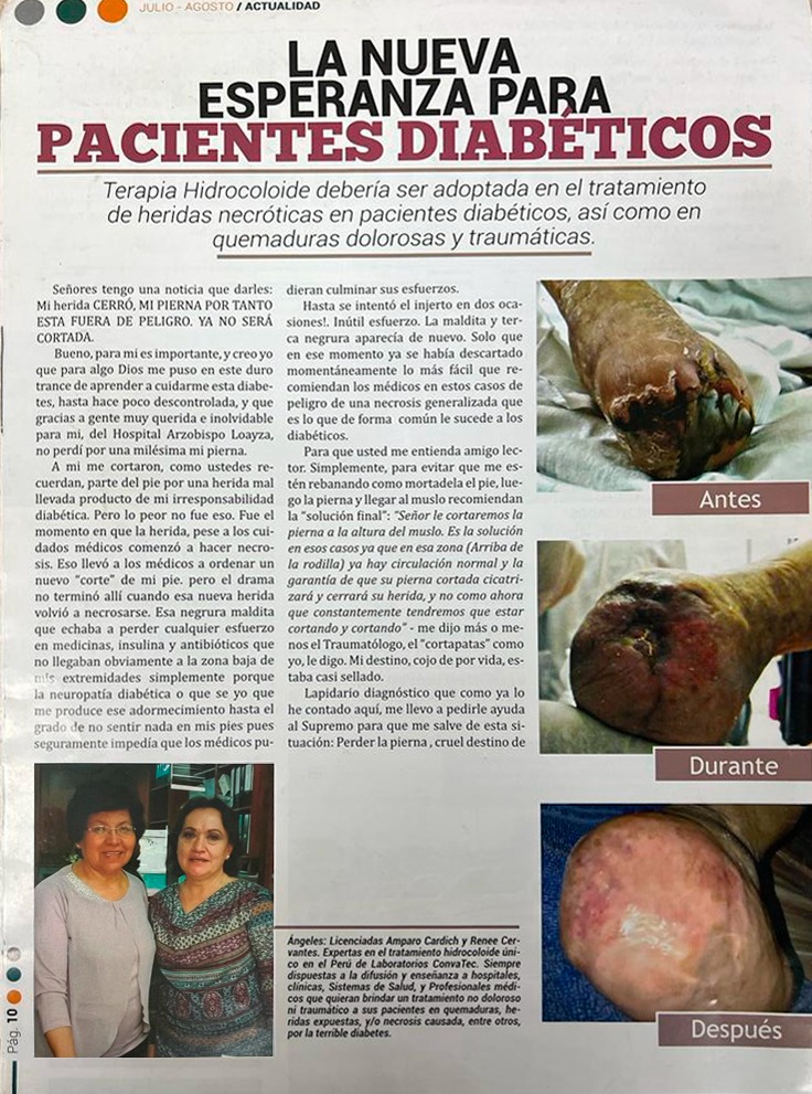 «Mención aparte merecen las Licenciadas Renee Cervantes Rosales y Maria Amparo Cardich representantes de esta empresa que busca familiarizar y apoyar no solo a los diabéticos en este tipo de heridas sino a los quemados a través de esta revolucionaria técnica de Terapia Hidrocoloide»